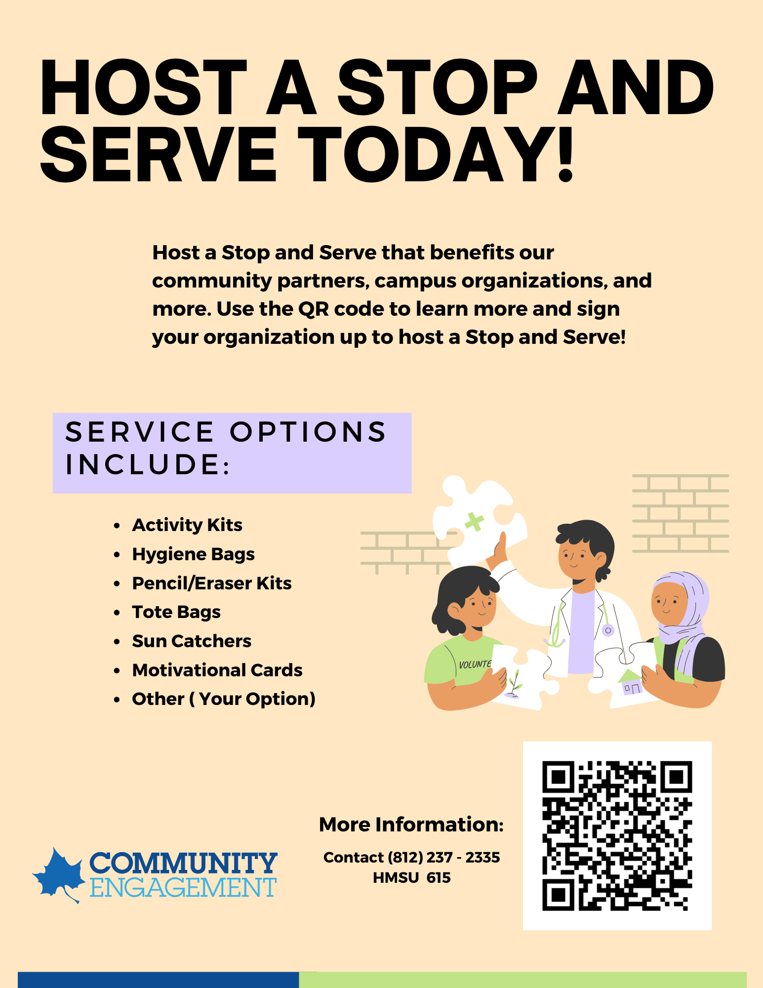 Host a Stop and Serve that benefits our community partners, campus organizations, and more. Use the QR code to learn more and sign your organization up to host a Stop and Serve!